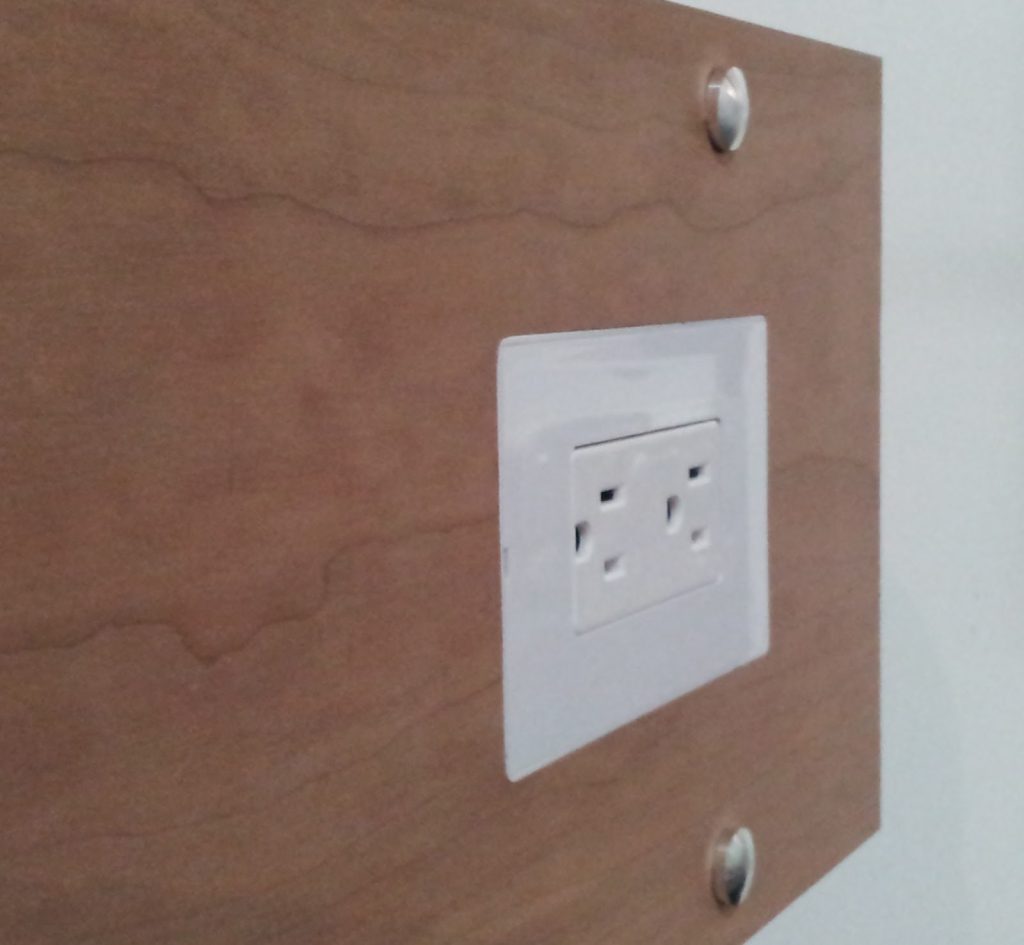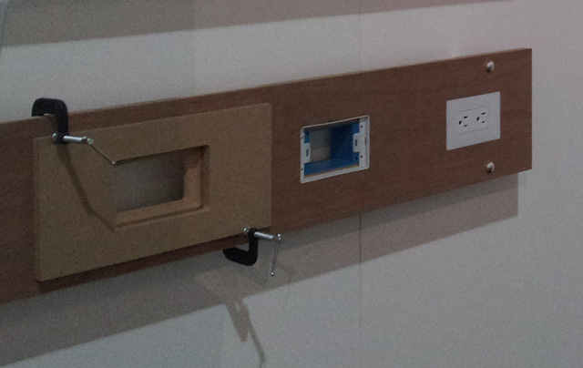The wood is cut out for the junction box. Then using a template that will be available from DesignMod, the wood is routed out to make room for a flange. The junction box is then inserted, the Smoothline wood flange is inserted, and the outlet, switch or accessory connection is inserted. Then the final Smoothline flush outlet cover is snapped in place.